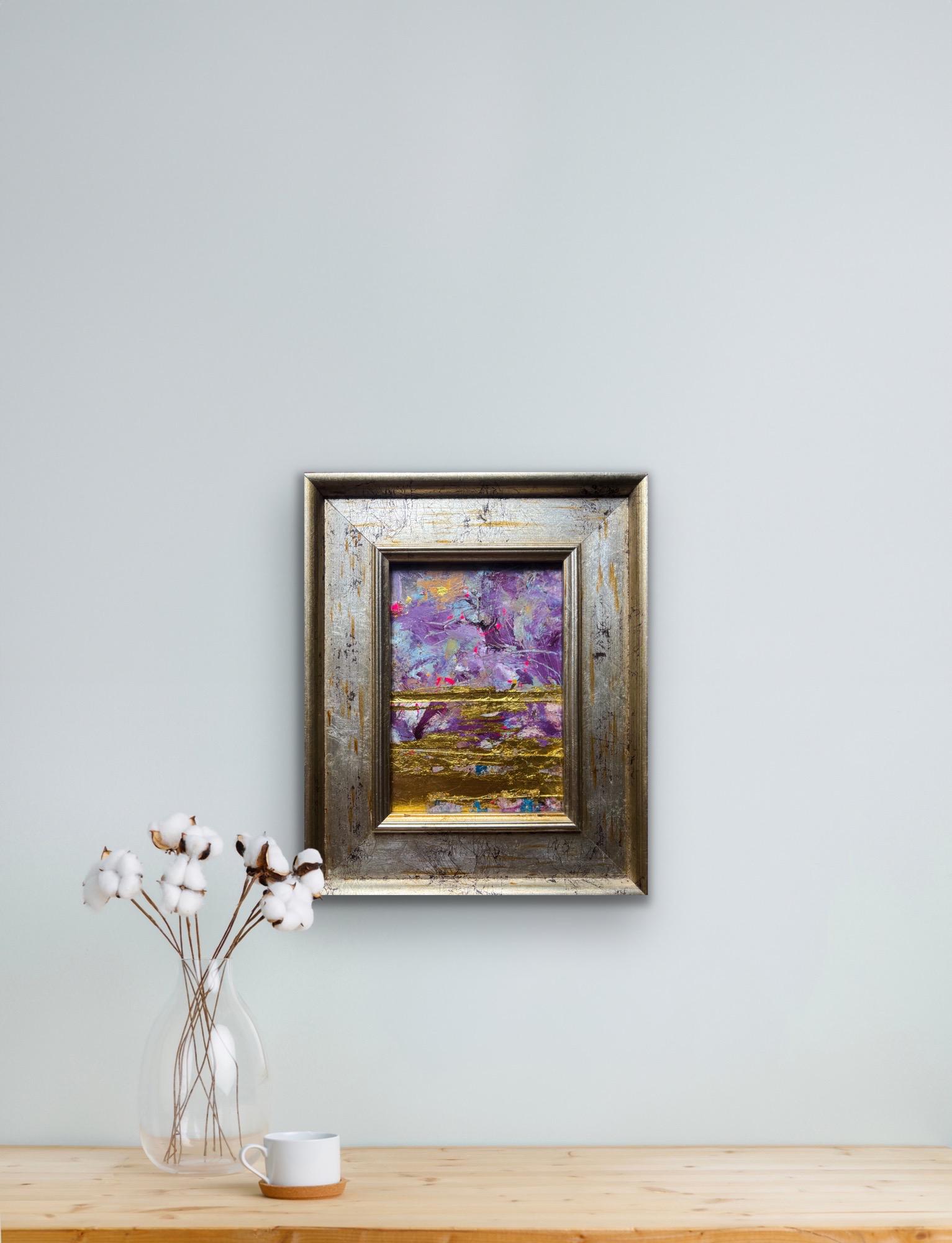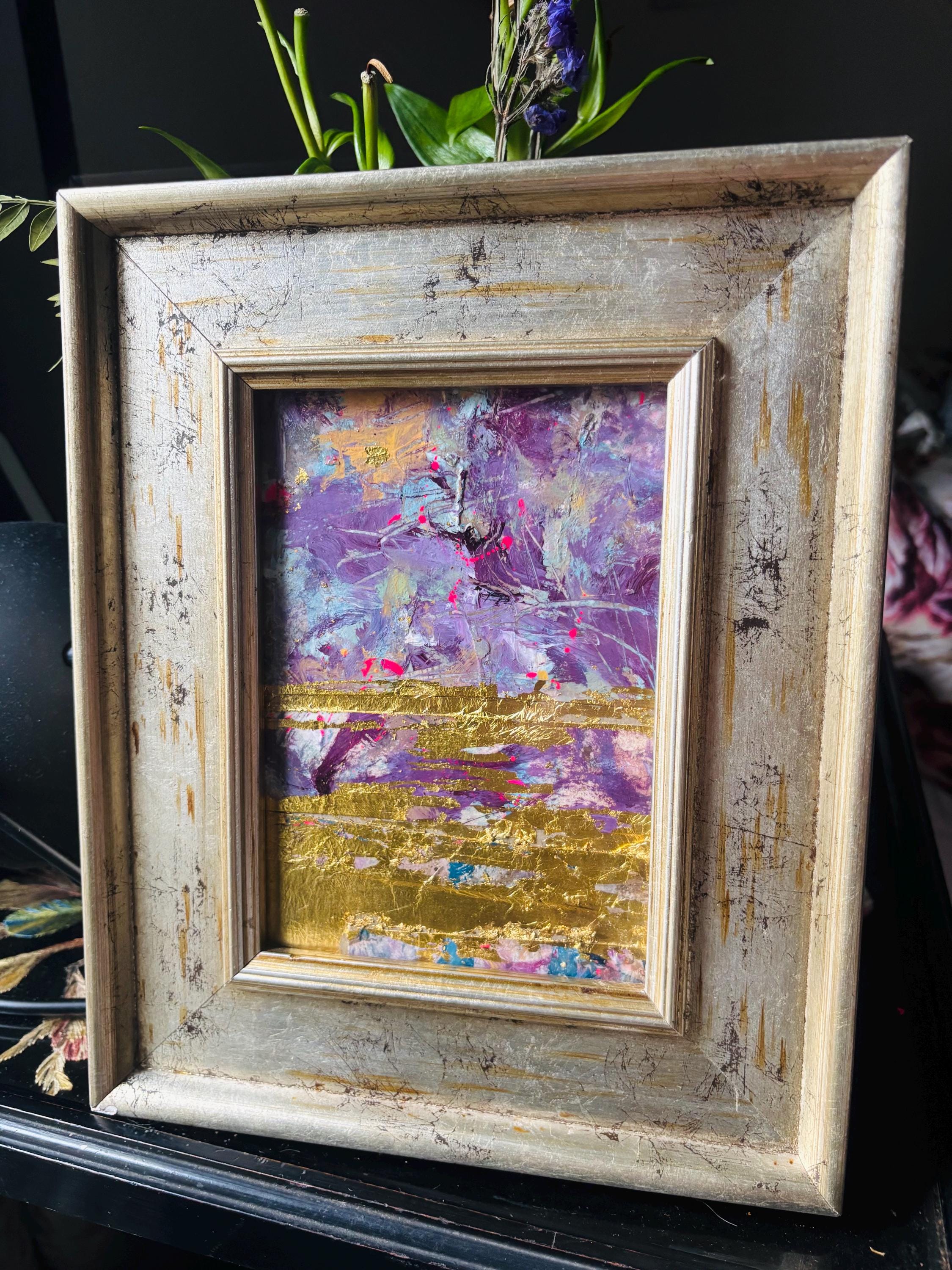 A moment of beauty VII a richly layered collage of acrylic paint, ink and gold leaf on cardboard, framed in a beautiful distressed silver and gold vintage market frame, one of a special collection sourced by my dad.