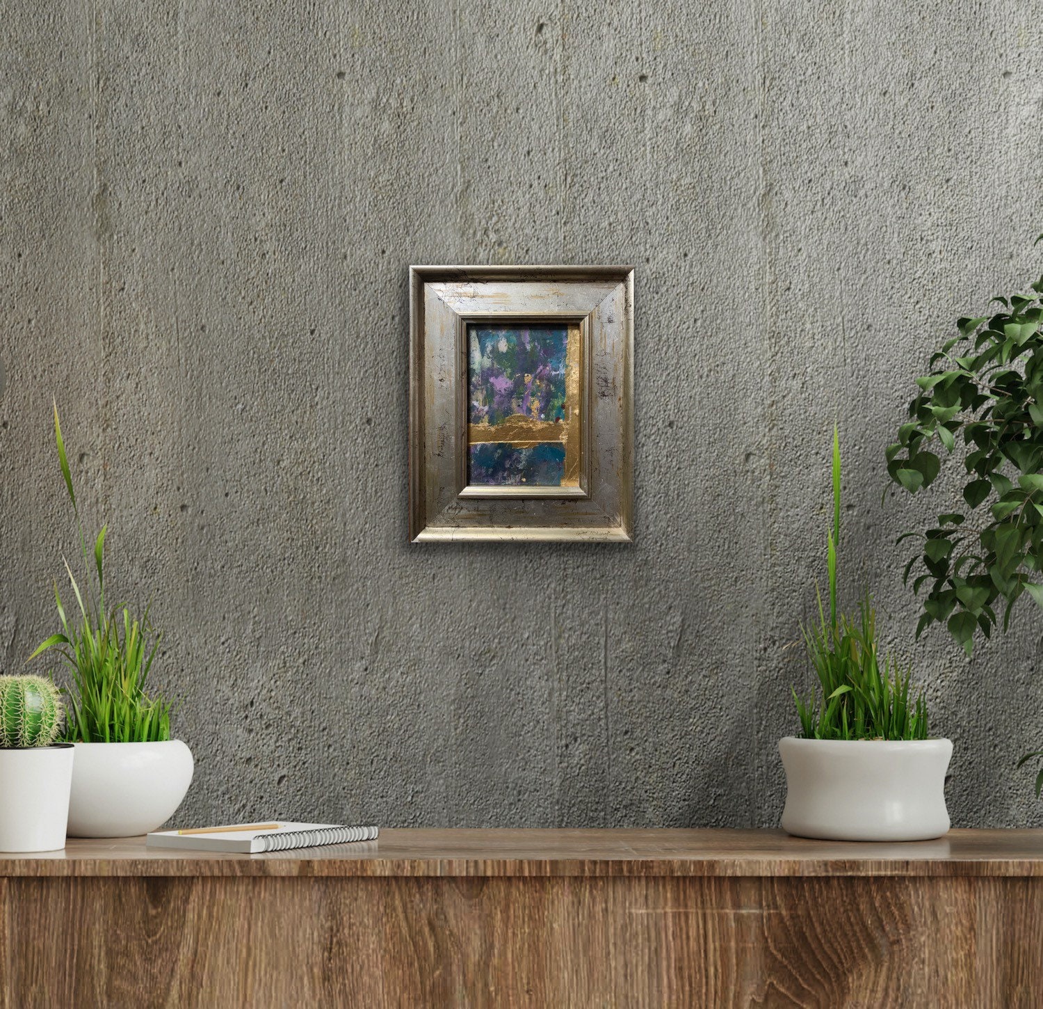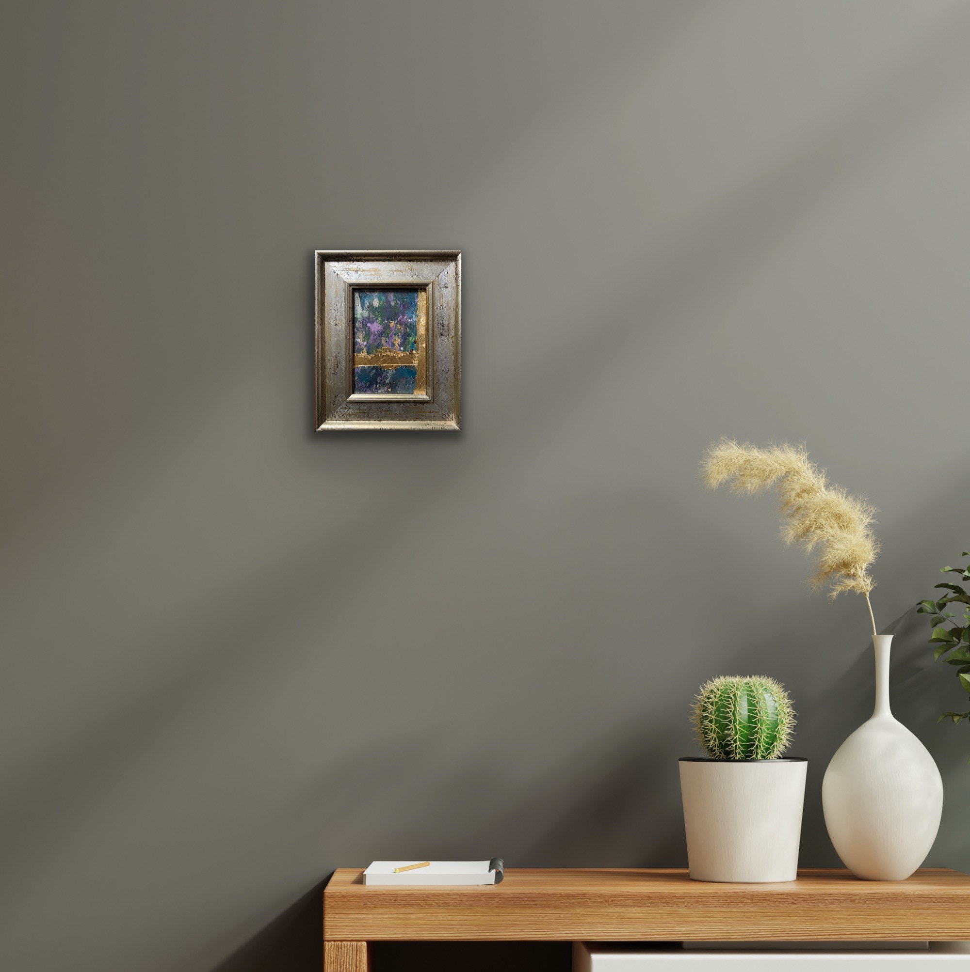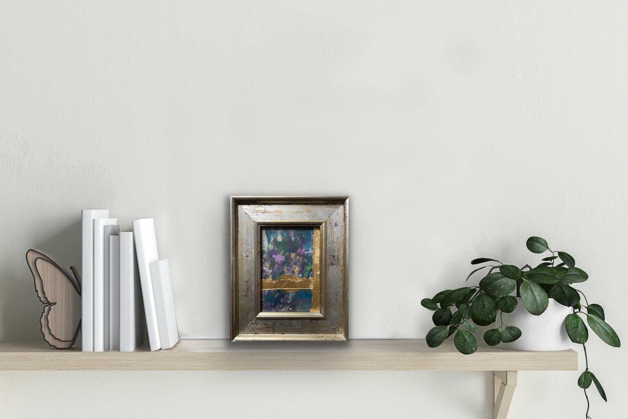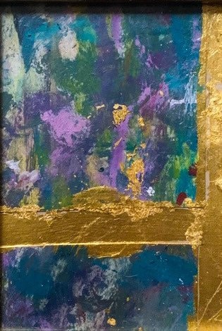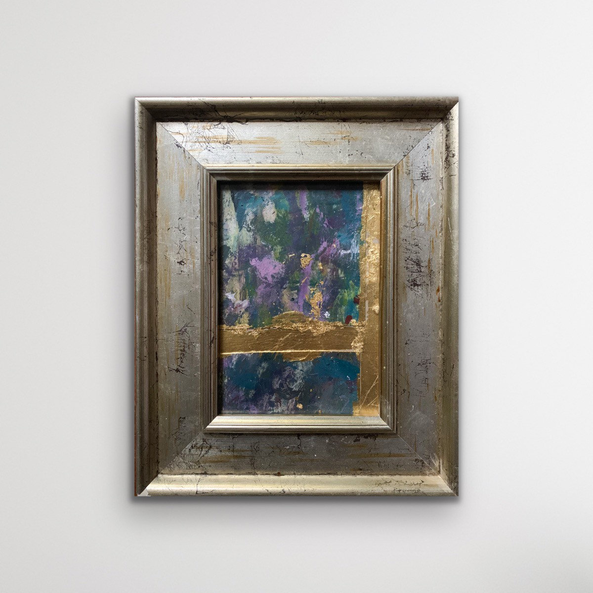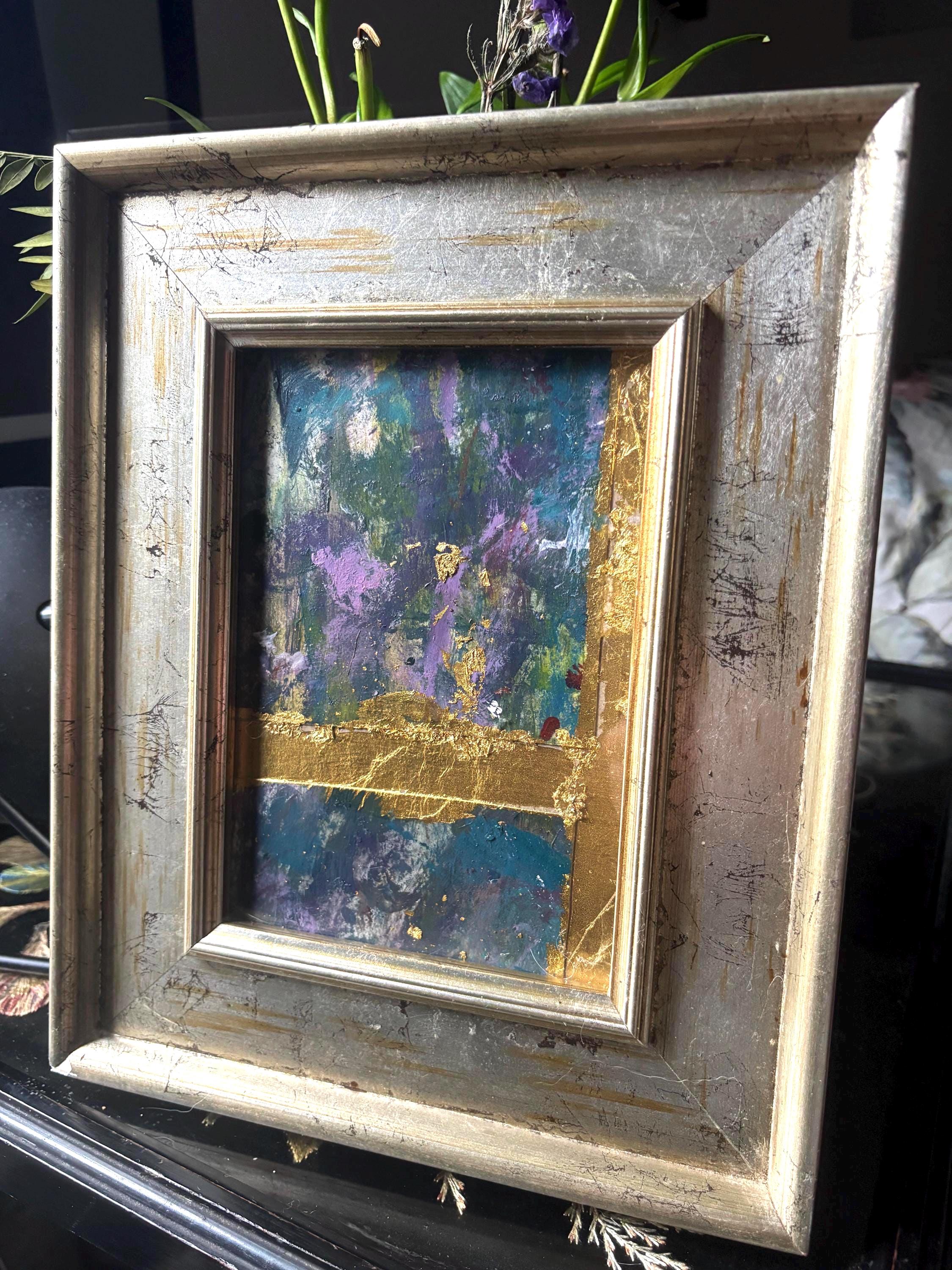 A moment of beauty III a richly layered collage of acrylic paint, ink and gold leaf on cardboard, framed in a beautiful distressed silver and gold vintage market frame, one of a special collection sourced by my dad.