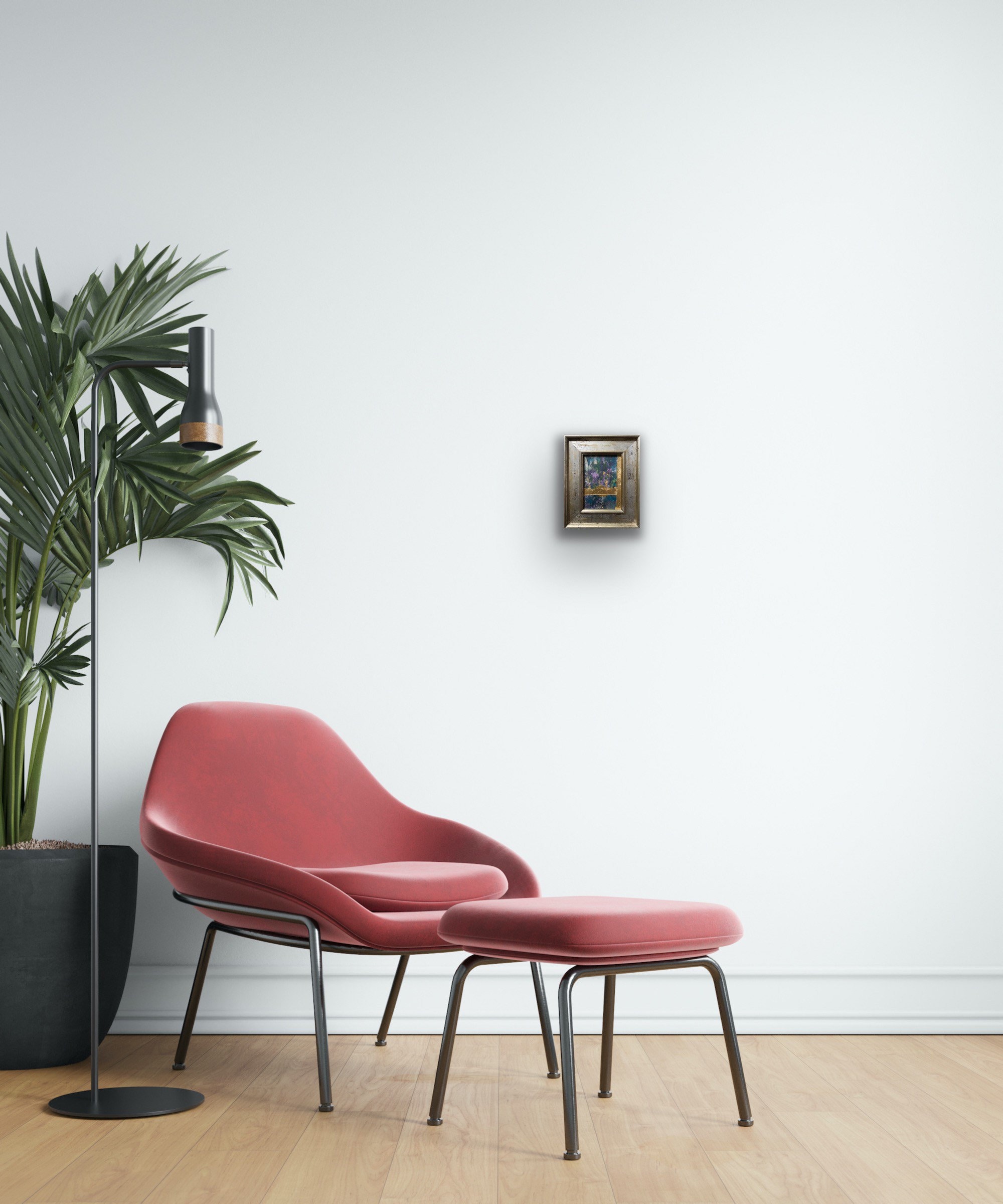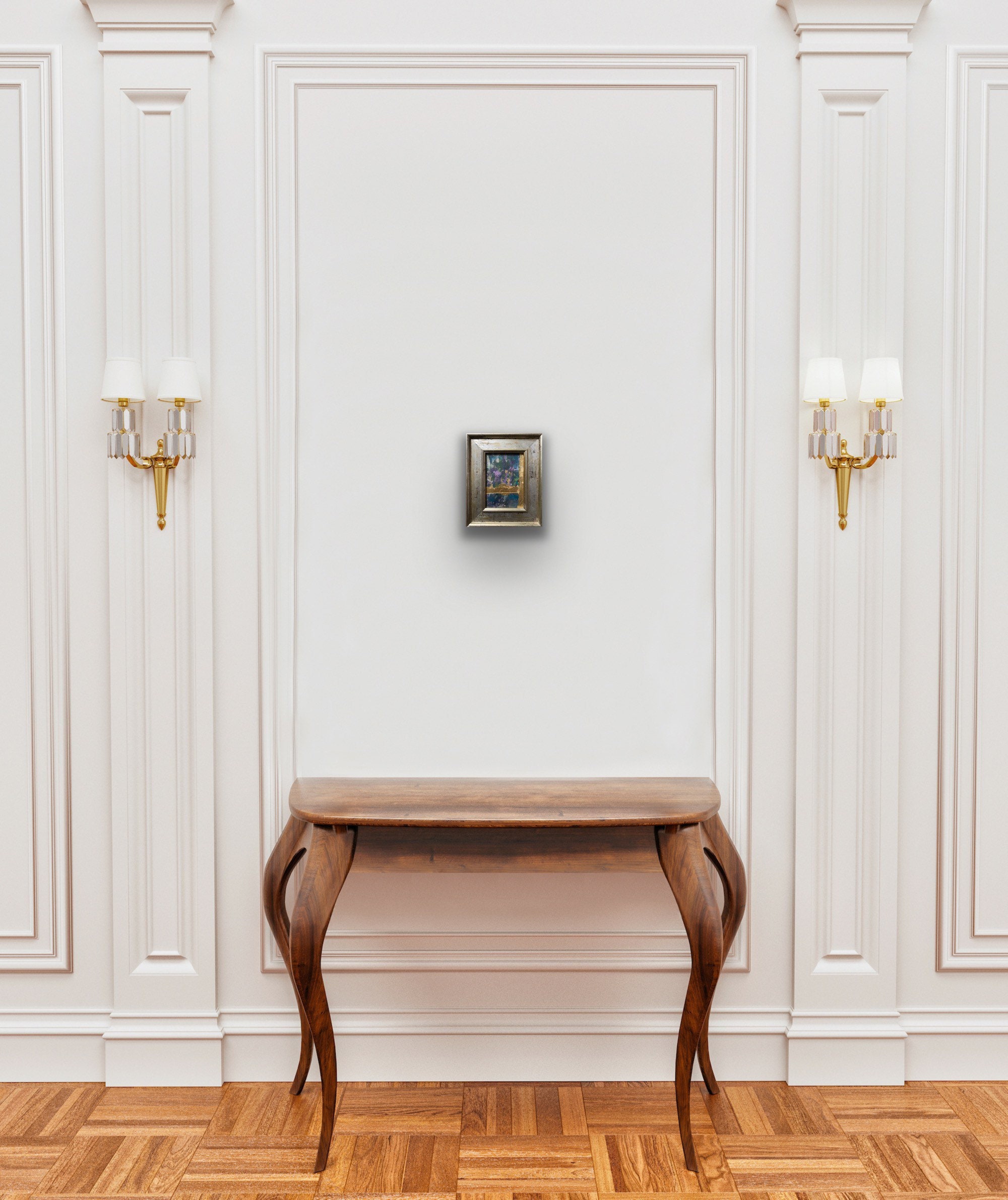 Deep blues and purples shimmer against the gold leaf as the light moves across it no two viewings look the same.